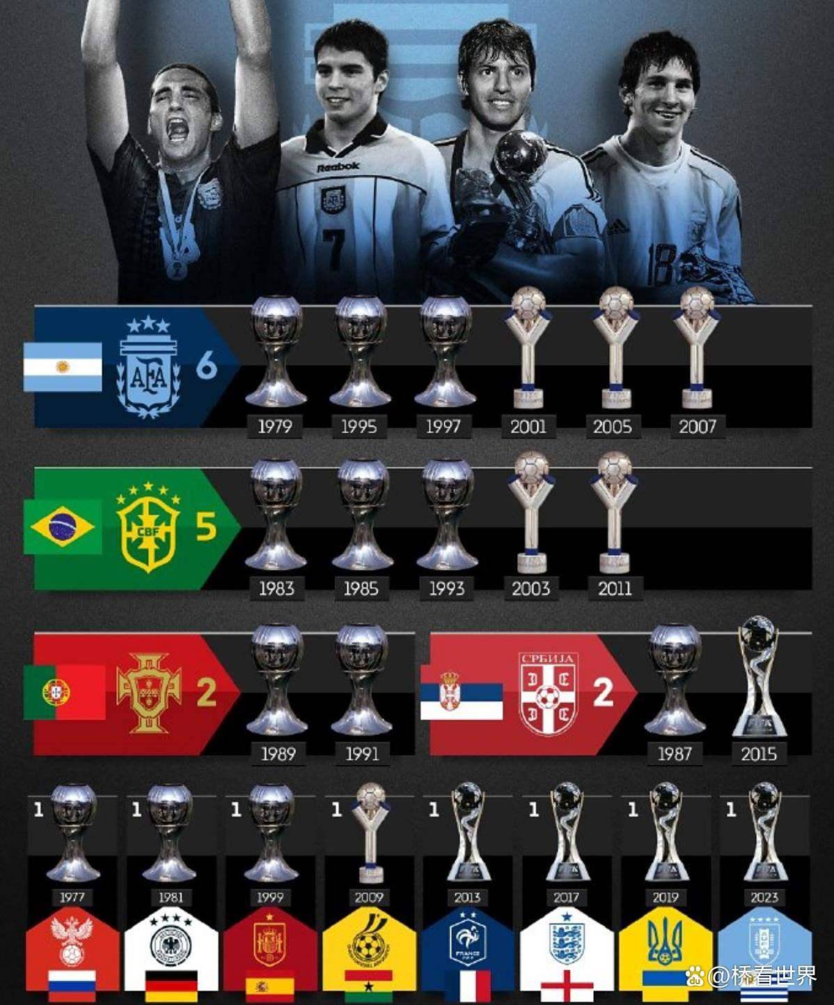下面,让我们一同回顾阿根廷U20国家队夺得的六座世界杯冠军奖杯,重温那些激动人心的时刻: